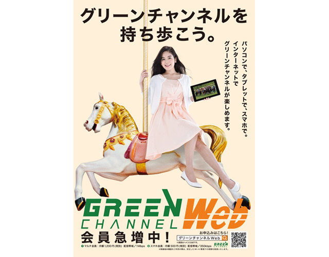 中央競馬全レースをライブ配信するJRA公式の動画配信サービスの告知ポスター・チラシ。-