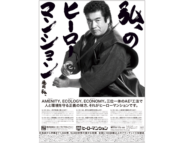 社名"ヒーロー"から、 藤岡弘,さんを起用。題字も本人にお願いしました。-