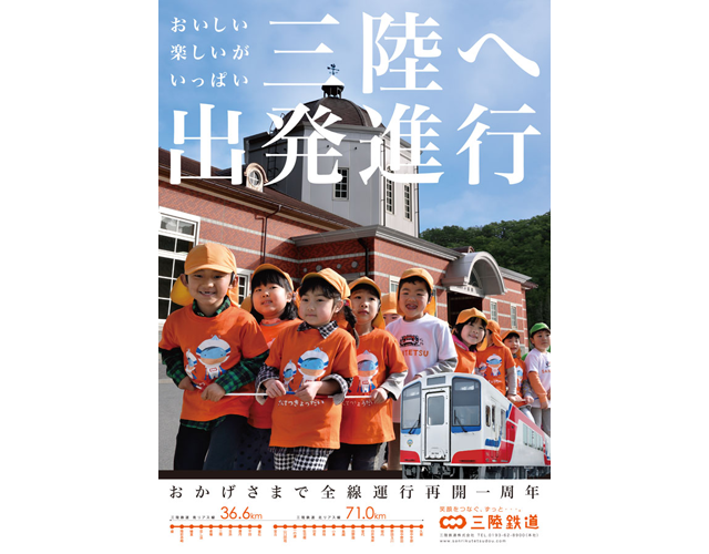 東日本大震災津波災害からの復興。南・北リアス線全線運行再開一周年記念ポスター。-